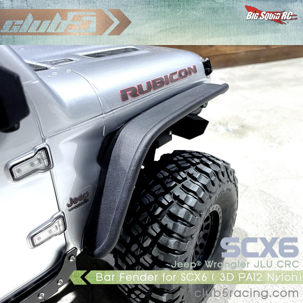 Club 5 Racing has announced its latest option piece for the Axial SCX6 Jeep Wrangler; 3D-Printed Bar Fenders. Made from durable PA12 nylon, these aftermarket fenders are narrower than the stock fenders and offer up a clean, minimized exterior for this massive trail machine.