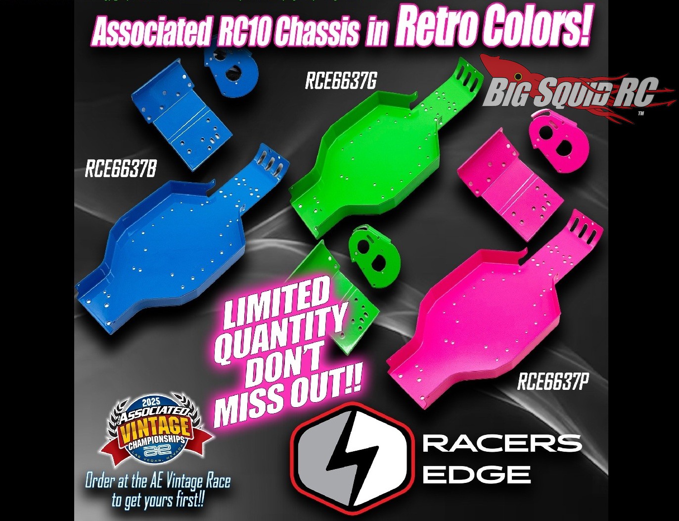 You can hit up this link to get your own Racers Edge Retro Colored Associated RC10 Chassis on the way that are street priced at $129 and have a part number of #6637.
