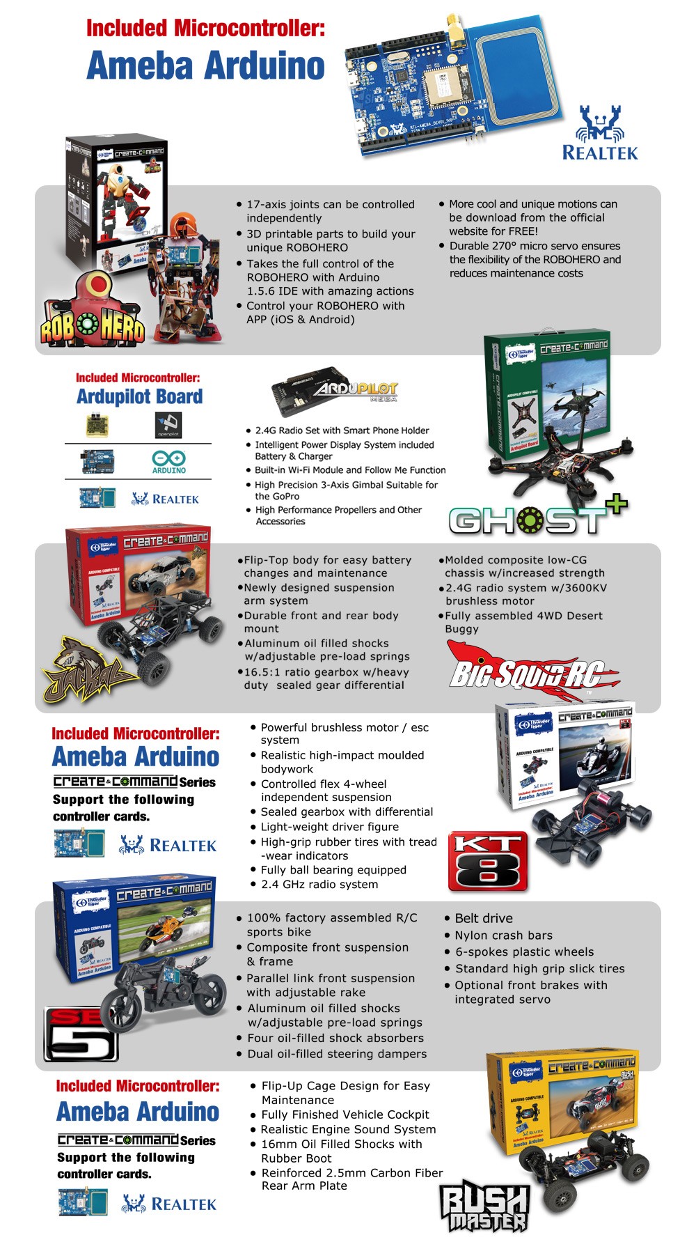The Create & Command line takes a number of existing Thunder Tiger products and gives you the ability to add various sensors, that way you can program it like a real robotic to accomplish a task of your choosing. Maybe you want to create an autonomous off-road vehicle that drives itself around the track. Maybe you want a robotic that acts like a cockroach and hides from daylight. The possibilities are nearly endless with the Thunder Tiger Create & Command line-up.